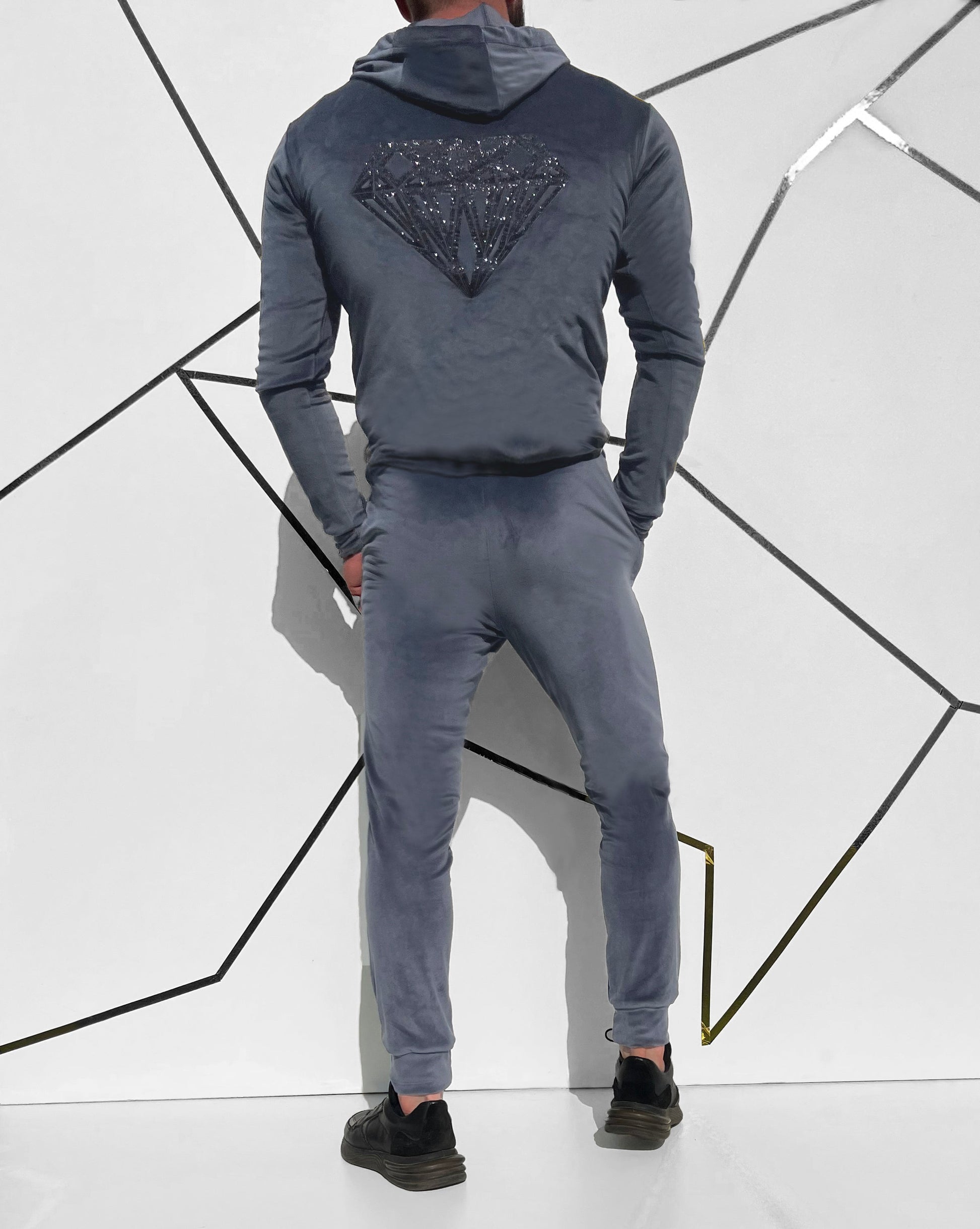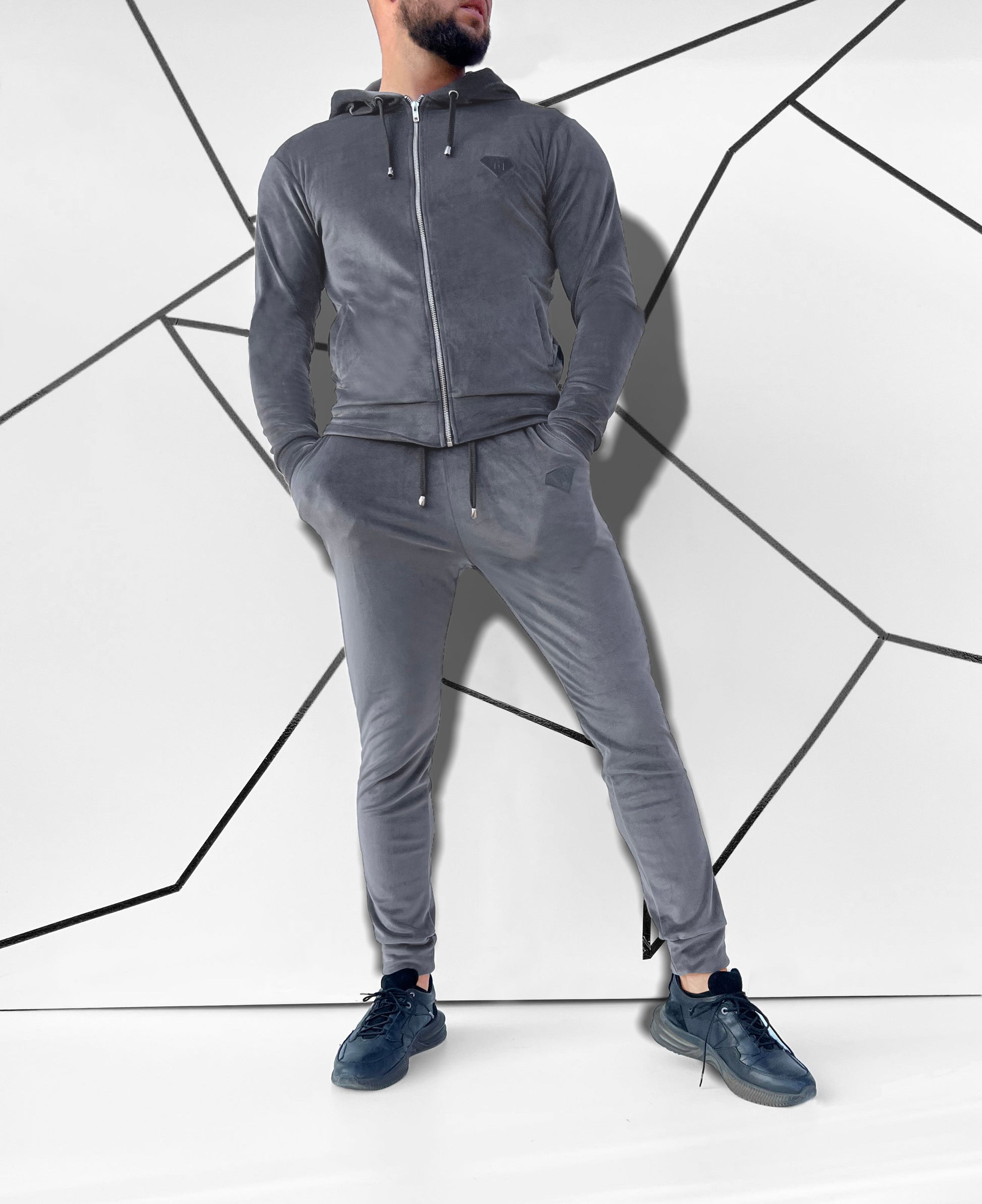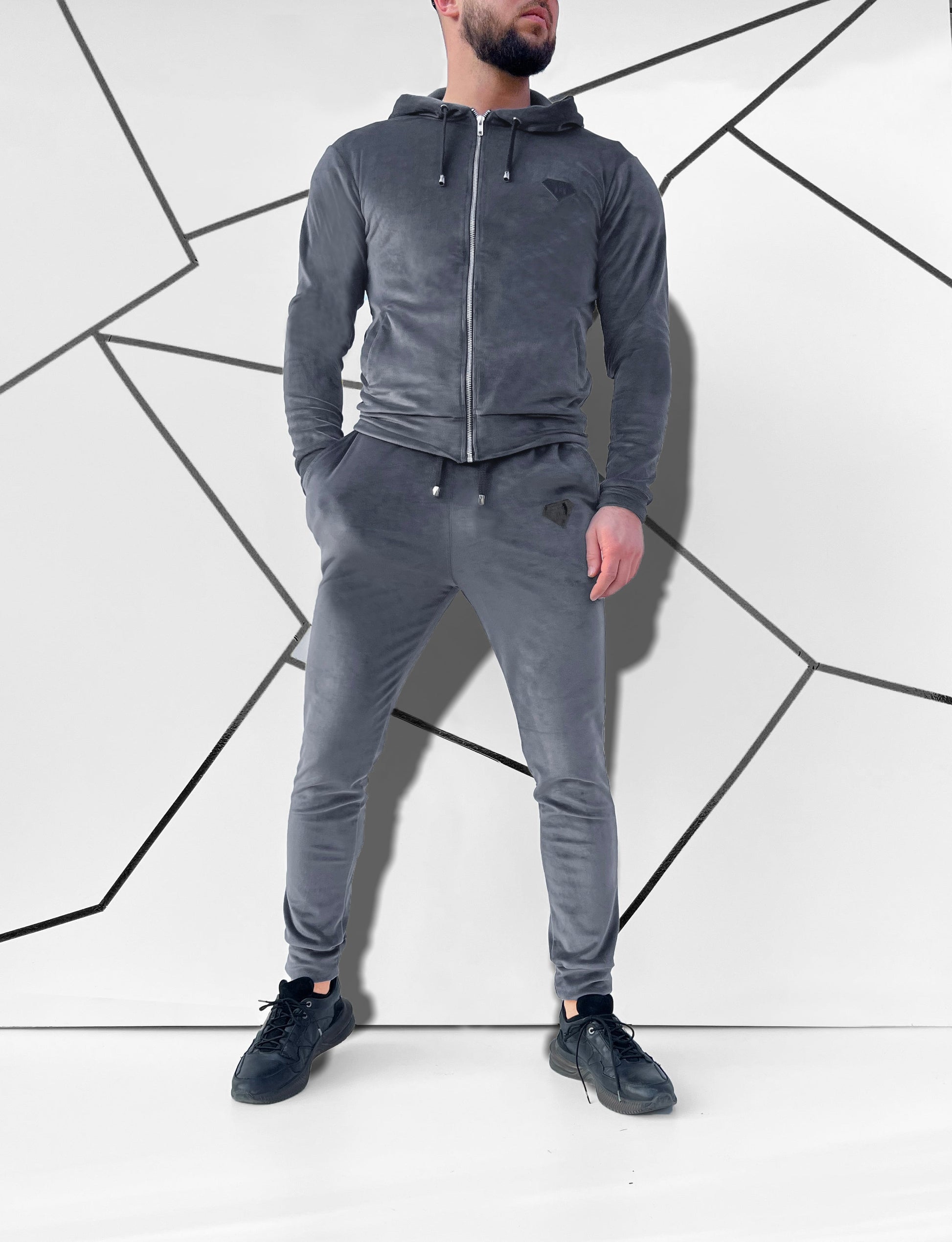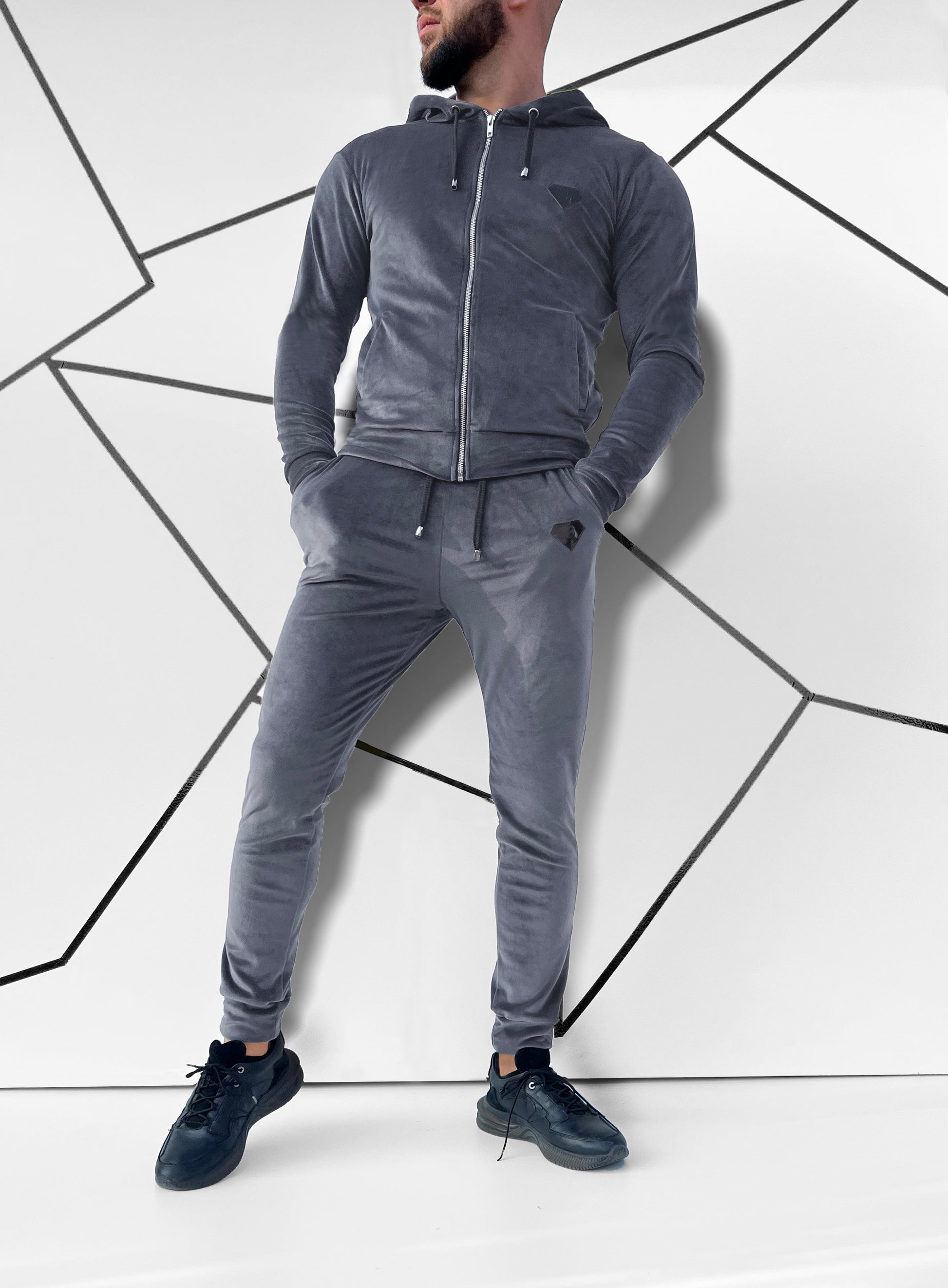 Veliūrinis vyriškas laisvalaikio kostiumas su kapišonu