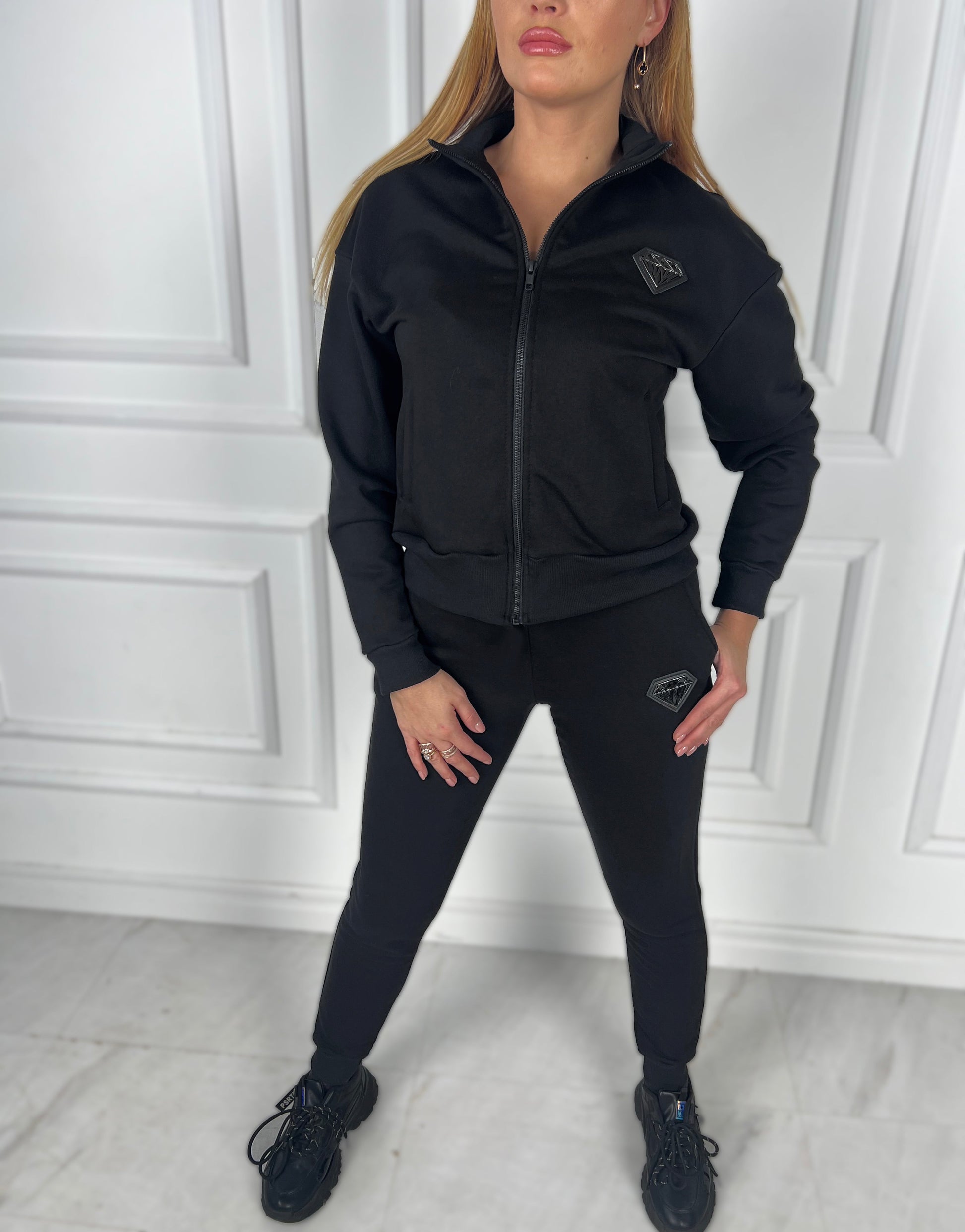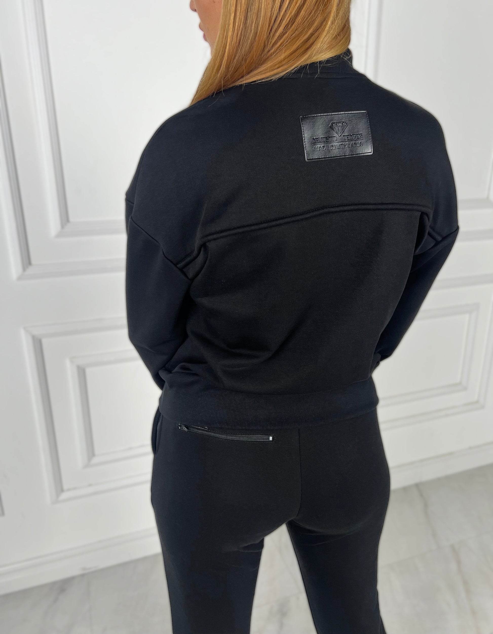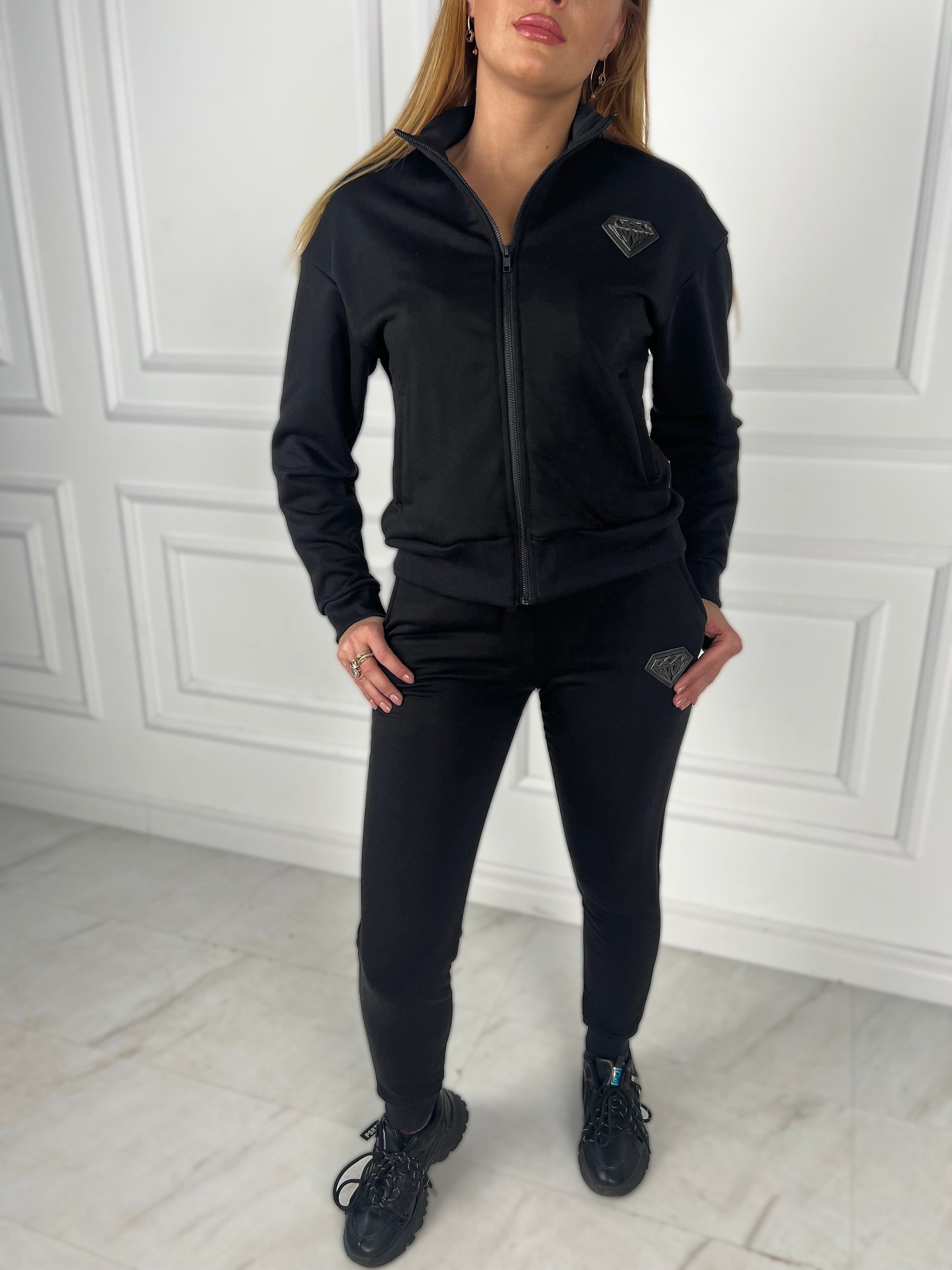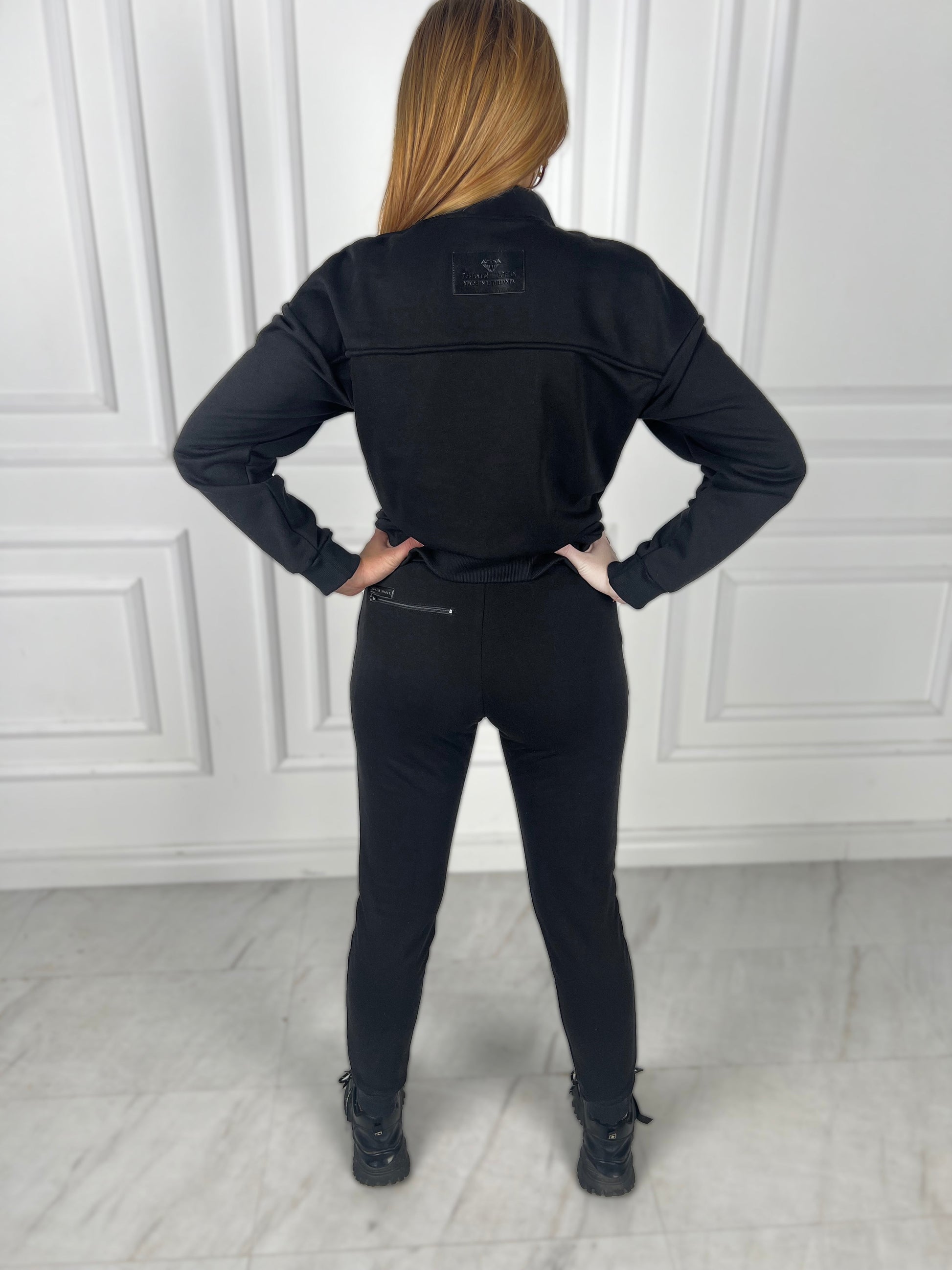 Kokybiškas medvilninis audinys, juodas YKK užtrauktukas, kišenės džemperio bei kelnių priekinėje pusėje, galinė kišenė su užtrauktuku kelnių nugarinėje pusėje.