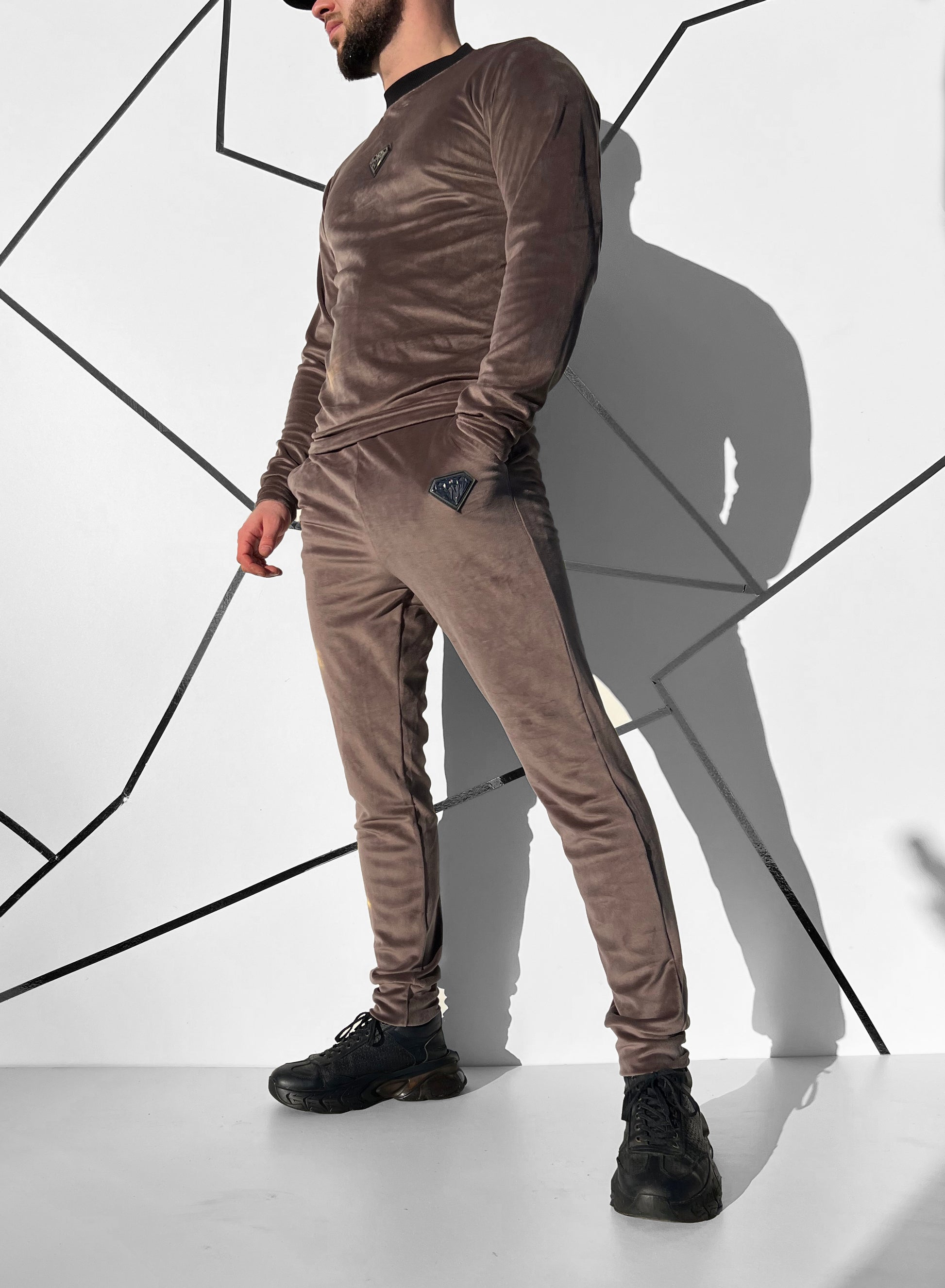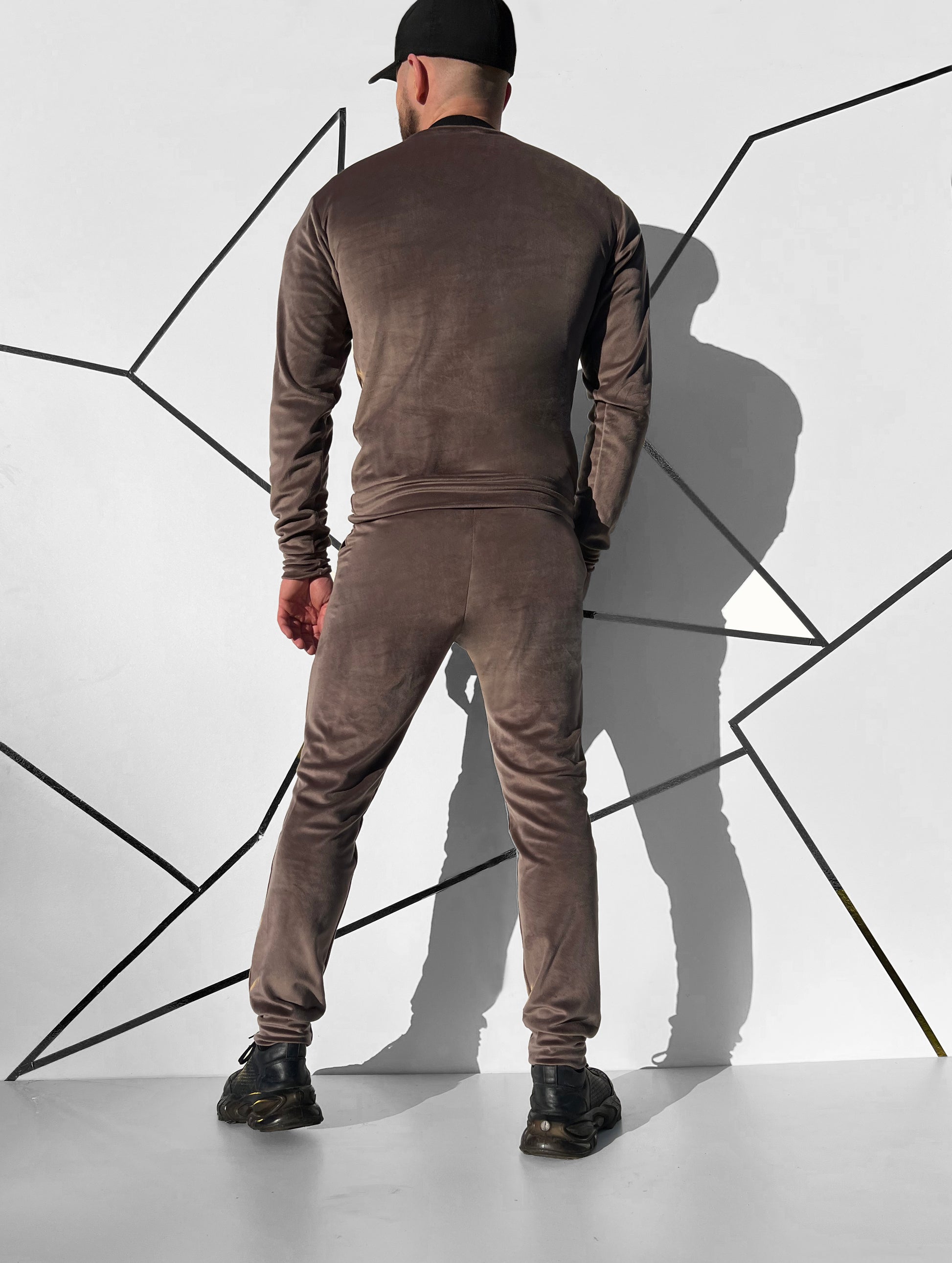 Kakavinis veliūrinis slim-fit laisvalaikio kostiumas be užtrauktuko.