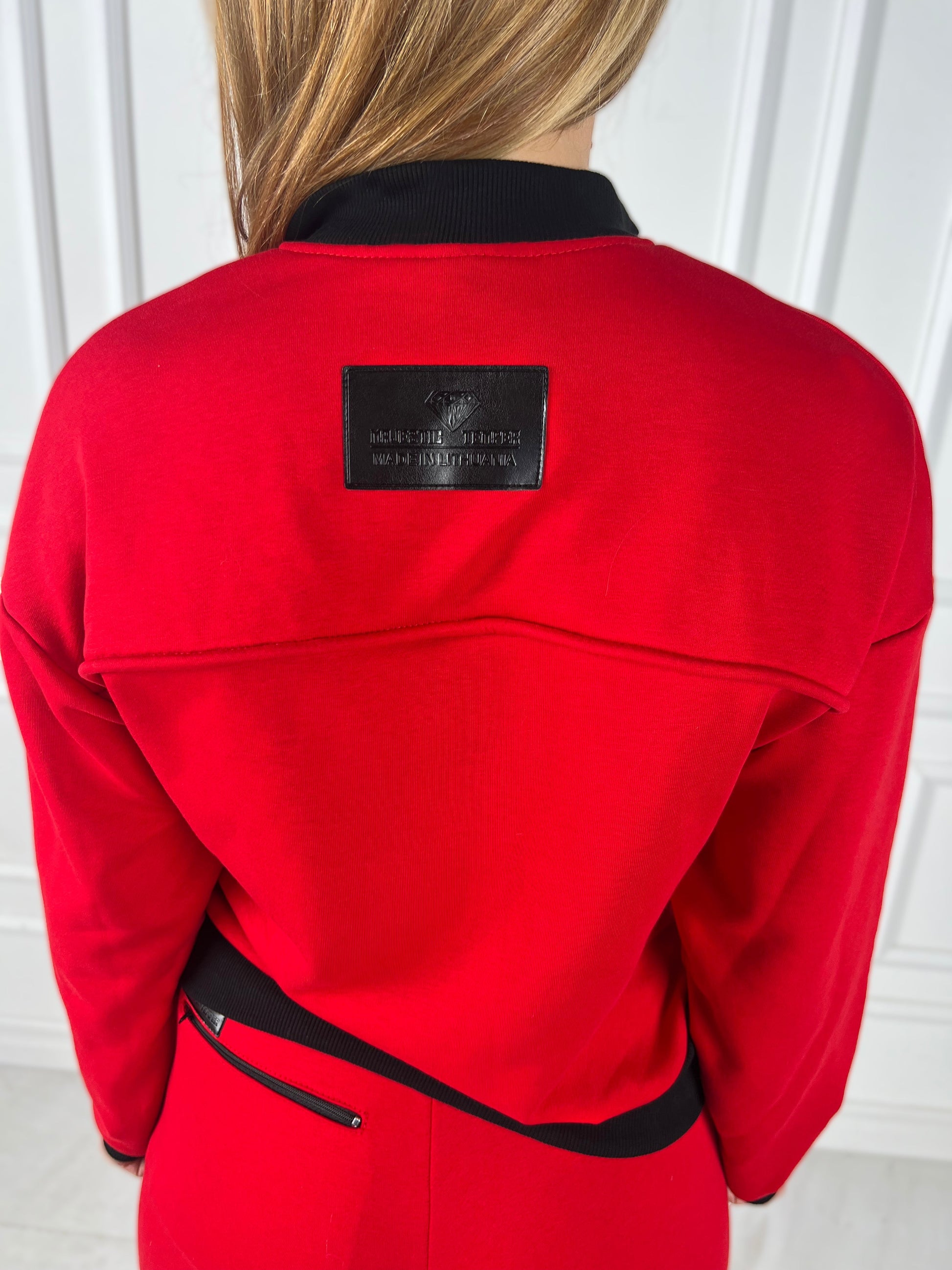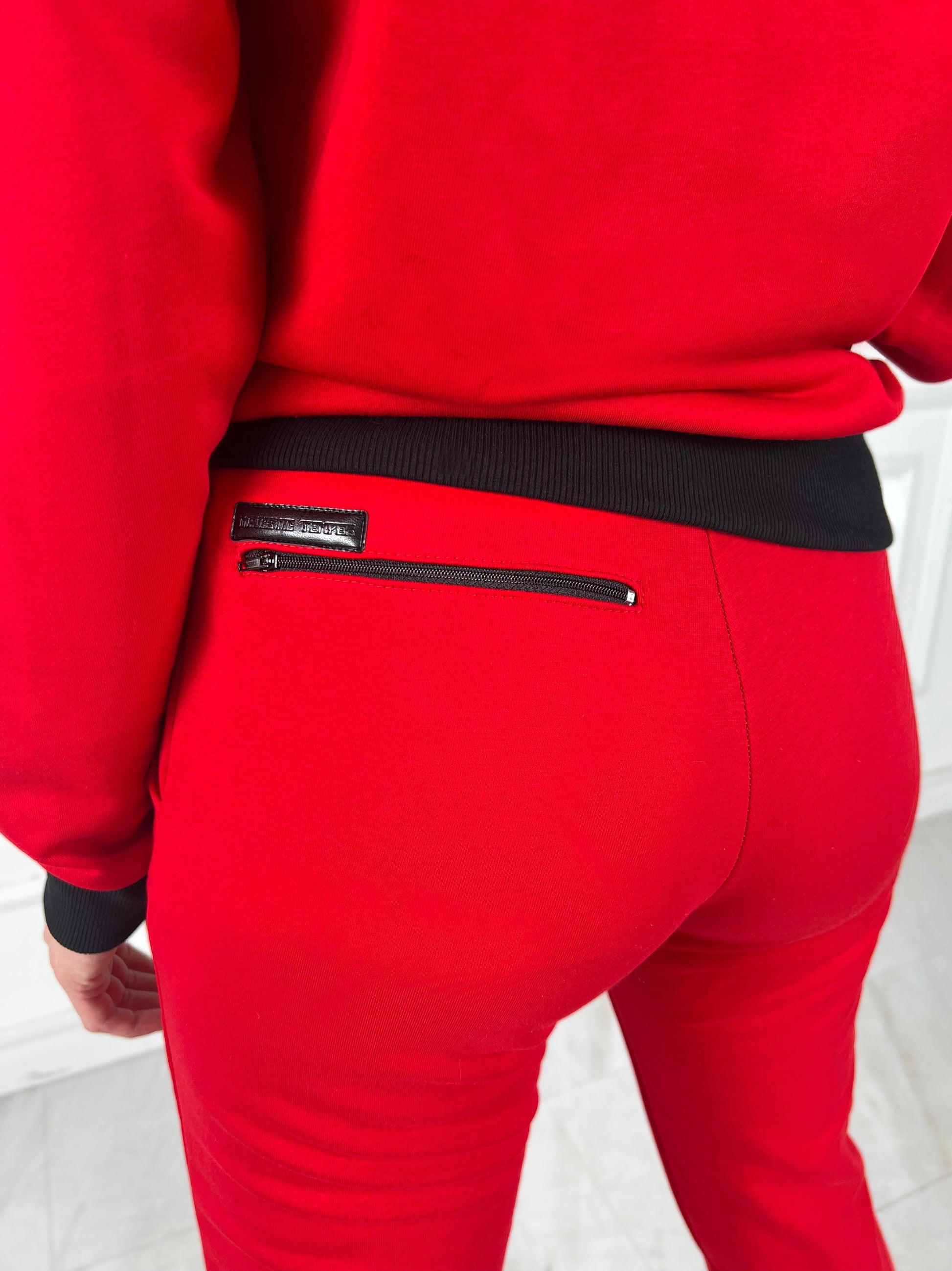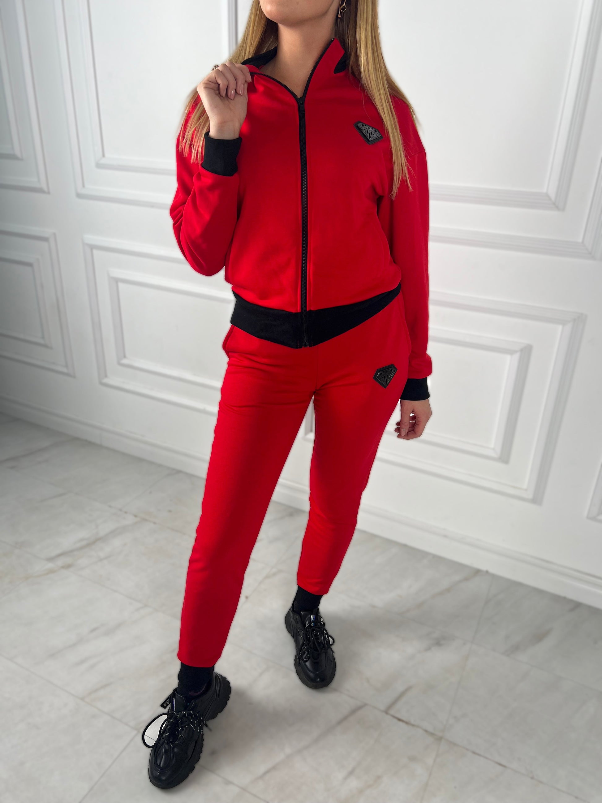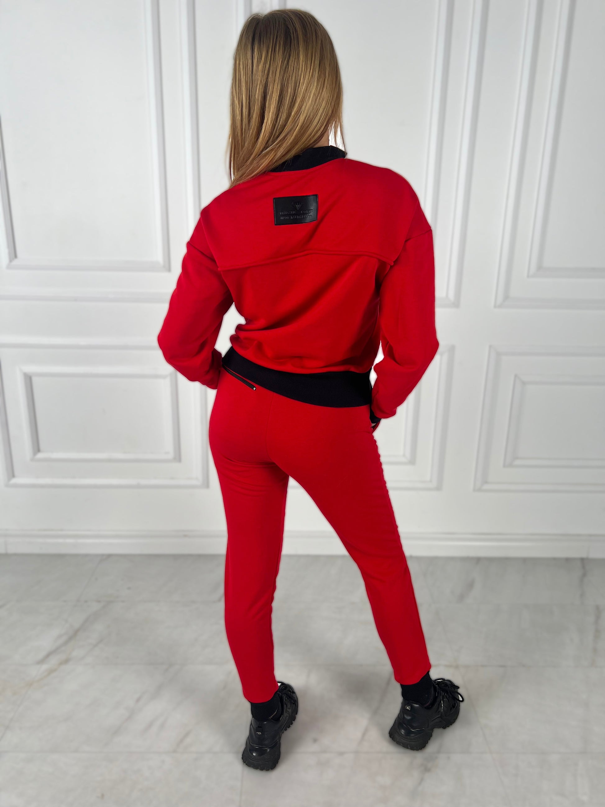 Raudonas medvilninis laisvalaikio kostiumas nuleista pečių linija